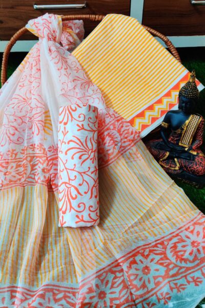 Yellow Floral Sanganeri Top and white abstract print Cotton Bottom with Chanderi Dupatta