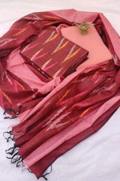 Carrot Red Bhagalpuri Ikat Top with Red plain Bottom and Ikat Cotton Dupatta