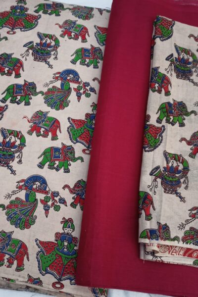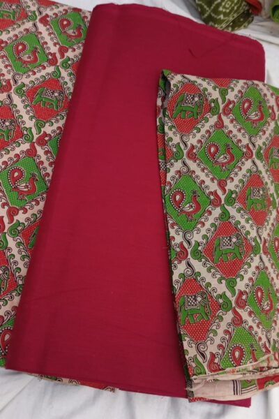 Red plain Mangalgiri Cotton Top with Offwhite circus print Bottom and similar Dupatta