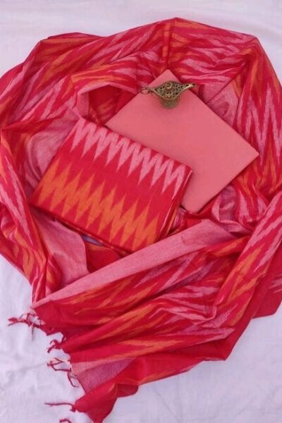 Red multicolour Bhagalpuri Ikat Top and plain Peach Bottom with Ikat Cotton Dupatta