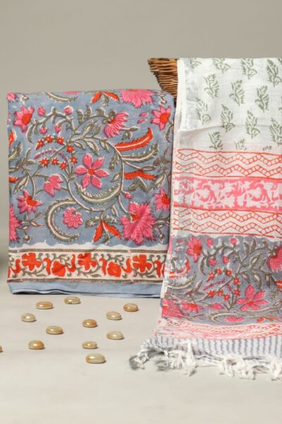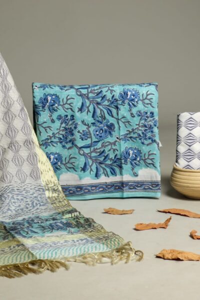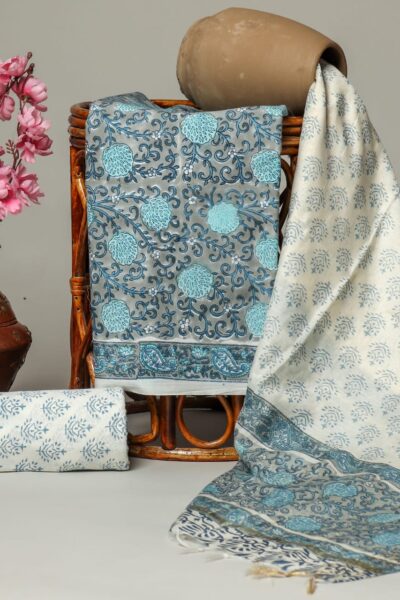 Floral Greyish Blue Cotton Top with White Cotton Bottom and A linen Dupatta