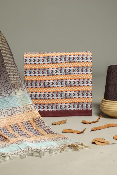 Geometric print Cotton Top and coffee brown Cotton Bottom with Chanderi Dupatta