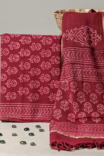 Deep Red Cotton Top with rose Motifs and Cotton Bottom with A linen Dupatta
