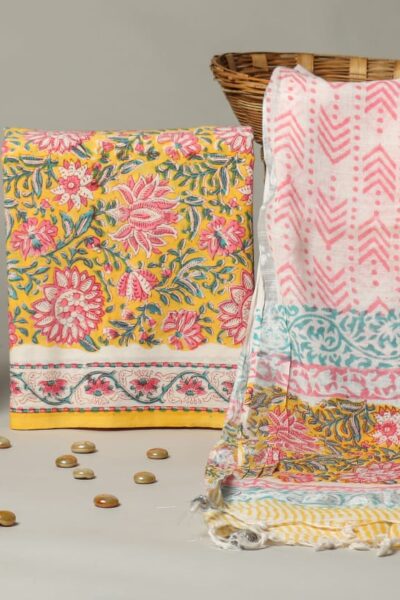 Floral Chrome Yellow Cotton Top with White Cotton Bottom and A linen Dupatta