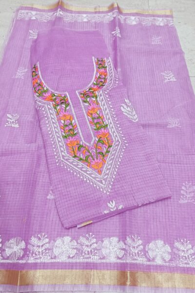 Lavender Kota cotton top with multicolour Yoke machine embroidery and same shade Kota Dupatta