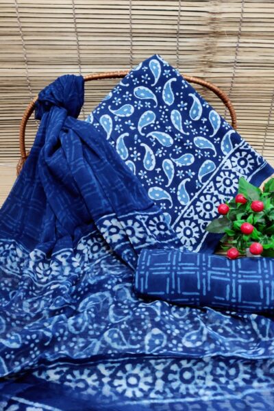 Indigo Cotton suit with Paisley Motif in Batik style paired with Chiffon Dupatta