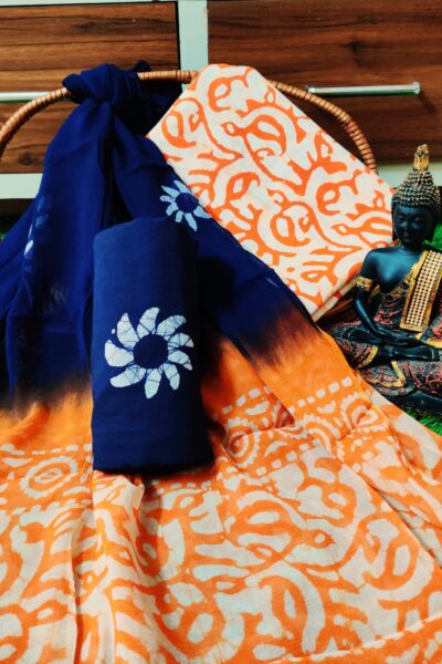 Orange Cotton suit with Paisley Motif in Batik style and blue Bottom with Chiffon Dupatta