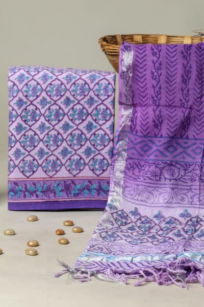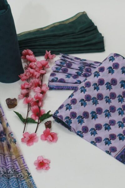 Lavender Cotton Top with Sunflower Motif and dark Greyish Blue Cotton Bottom with Chanderi Dupatta