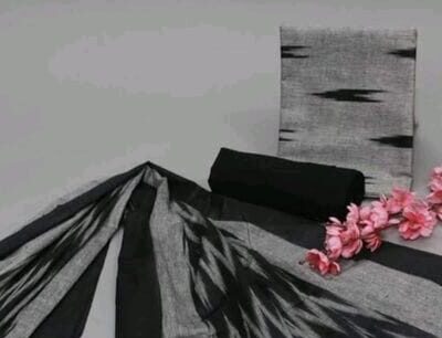 Grey and Black Bhagalpuri Ikat Top with plain Black Bottom and Ikat Dupatta
